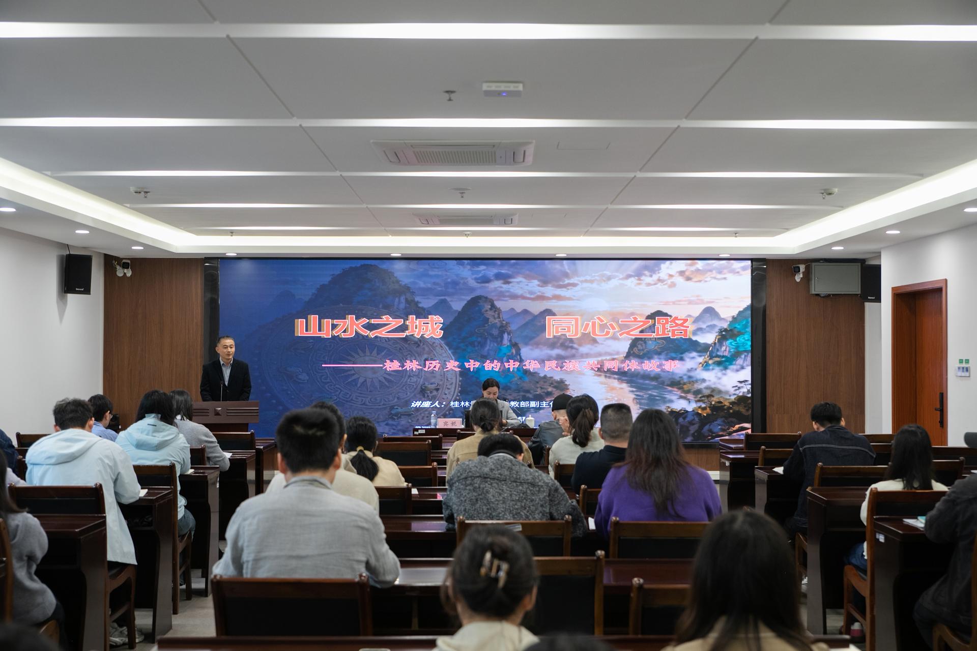 为深入学习宣传贯彻中央民族工作会议精神,深化铸牢中华民族共同体意识教育,11月7日,学校特邀桂林博物馆宣教部主任宾妮在知行楼818会议室开展《山水之城 同心之路——桂林历史中的中华民族共同体故事》主题讲座。各基层党组织统战工作者、各民主党派及无党派人士、知联会会员等参加活动。本次讲座由学校党委副书记李飞主持。