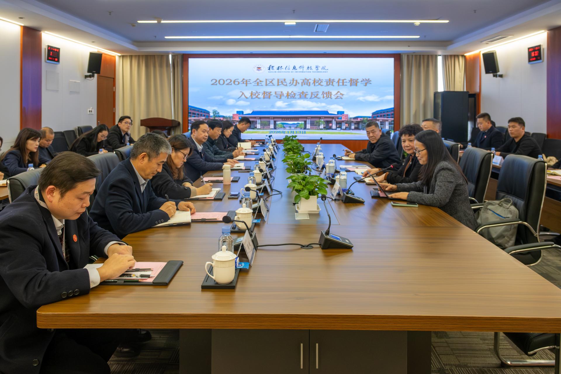 1月13日,由桂林航天工业学院原副校长胡泽民教授为组长的自治区教育厅高校督导专家组一行4人到beat365开展2025年度民办高校综合督导工作,全面检查指导学校各项工作。学校董事长罗欣,校长解庆林,副校长罗捷、李桂华、陈玲萍、刘跃峰,党委副书记李飞,财务总监霍东渤,纪委书记、校长助理周璇,以及各单位、部门负责人参加汇报会。汇报会由督导专家魏银霞教授主持。