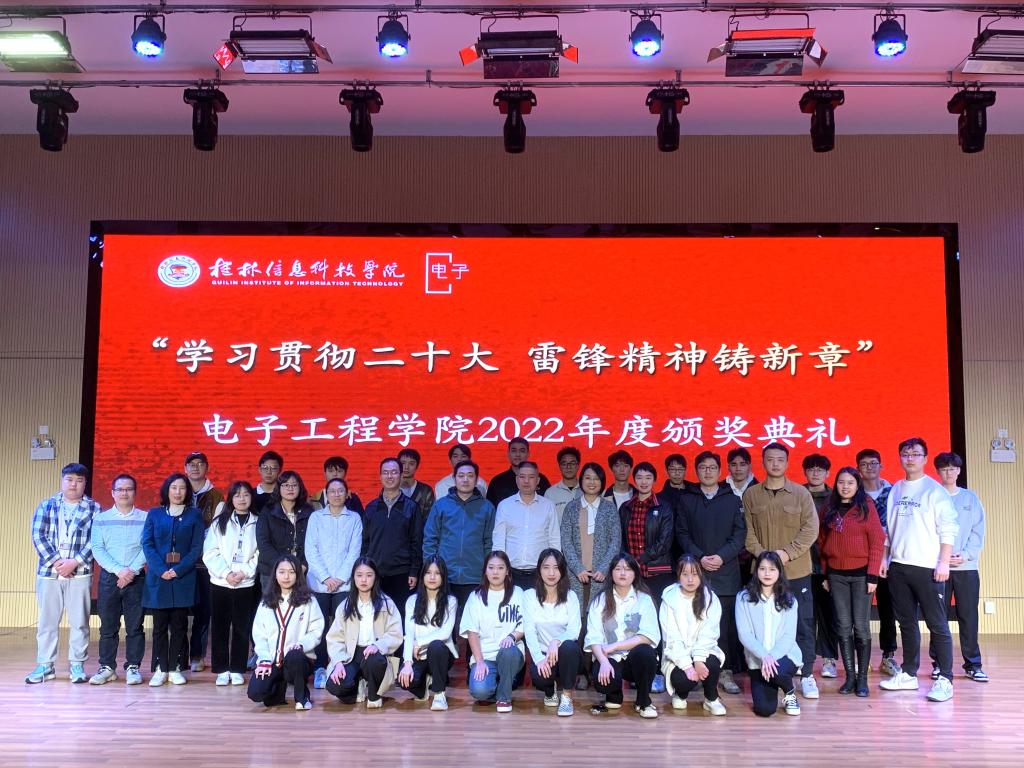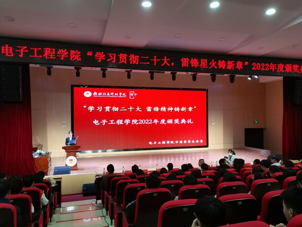 3月20日中午,电子工程学院在51206报告厅举办“学习贯彻二十大,雷锋星火铸新章”2022年度颁奖典礼,学院院长韩桂明、党总支书记庄璧瑛、各教研室教师代表及各年级辅导员出席了本次颁奖典礼,各年级共计240名同学参加典礼。