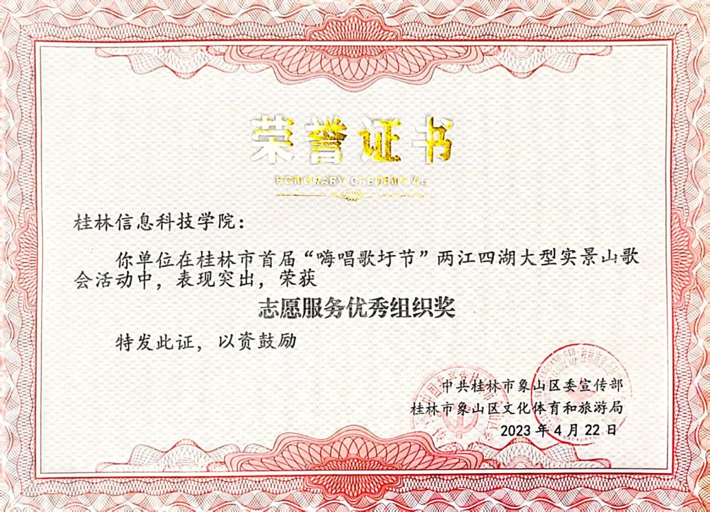 本次“嗨唱歌圩节”两江四湖大型实景山歌会的顺利举办,弘扬了优秀民族文化、进一步巩固和发展平等、团结、互助、和谐的社会主义民族关系。信息工程学院志愿者们在活动中体现奉献、友爱、互助、进步志愿服务精神,得到了主办方和参演团队的广泛好评,以实际行动助力桂林世界级旅游城市建设!
