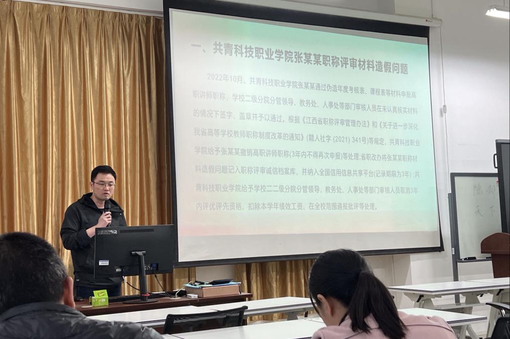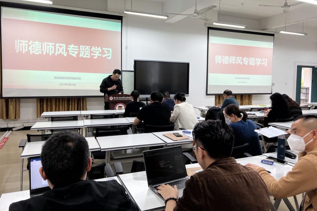 会上,许奇传达了学校党委教师工作部《关于举行教职工师德师风专项学习的通知》的有关精神。会议专题学习了习近平总书记关于师德师风建设的重要论述、学校《师德师风考核实施细则》等制度文件;学习了全国教育领域先进模范事迹——于漪、钟扬,号召全体教职工向优秀楷模学习,切实担当起“为党育人,为国育才”的神圣使命;就教育部公开曝光的违反教师职业行为十项准则典型案例进行了深入的剖析,强调指出要以案为鉴,牢固树立底线意识,在思想政治、教书育人、学术道德、工作生活等各方面规范自己的言行。会后,学院组织教职工通过全国高校教师网络培训中心、国家智慧教育公共服务平台等网络培训学习平台自学师德师风相关课程。