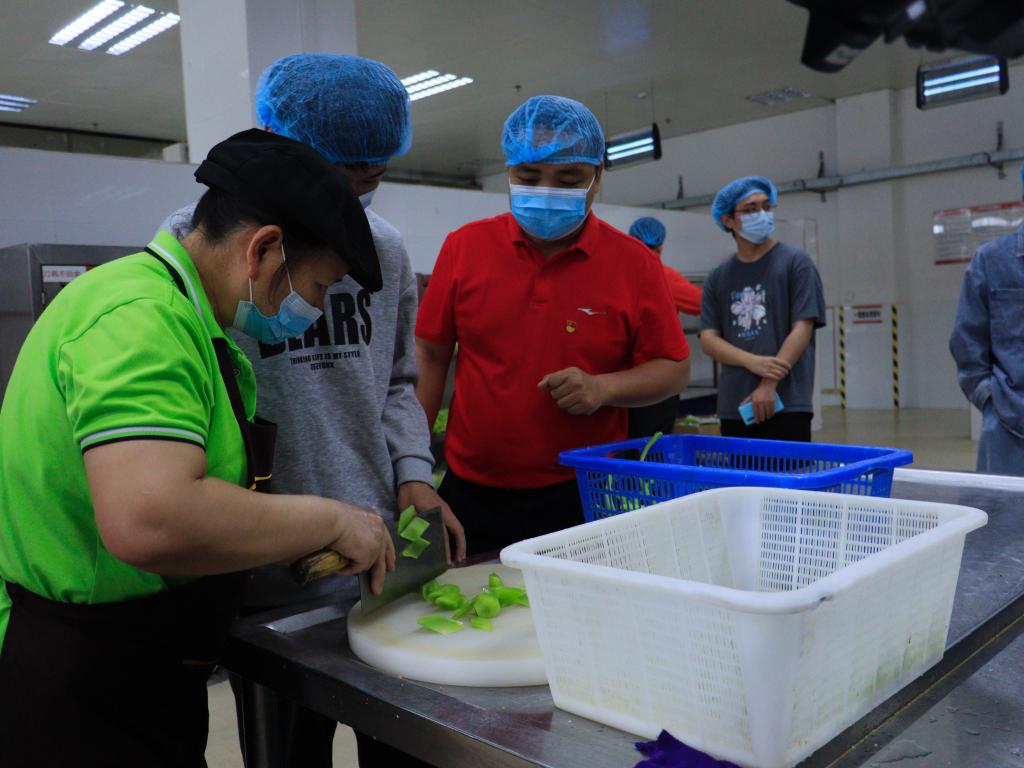 活动内容分为参观后厨和亲自体验两个部分。秦经理带领师生代表们依次参观了食材库、洗菜间、切配间、加工间、洗消间等各功能区域,并为大家详细介绍了学校食堂原材料采购、食品贮存、生产加工、食品留样、清洗消毒、员工管理等情况。参观期间,师生们积极参与,亲自体验了菜品粗加工和食品热加工工作,并在售卖间化身“打饭侠”,体验打饭、售卖,烫粉、出餐等工作流程。