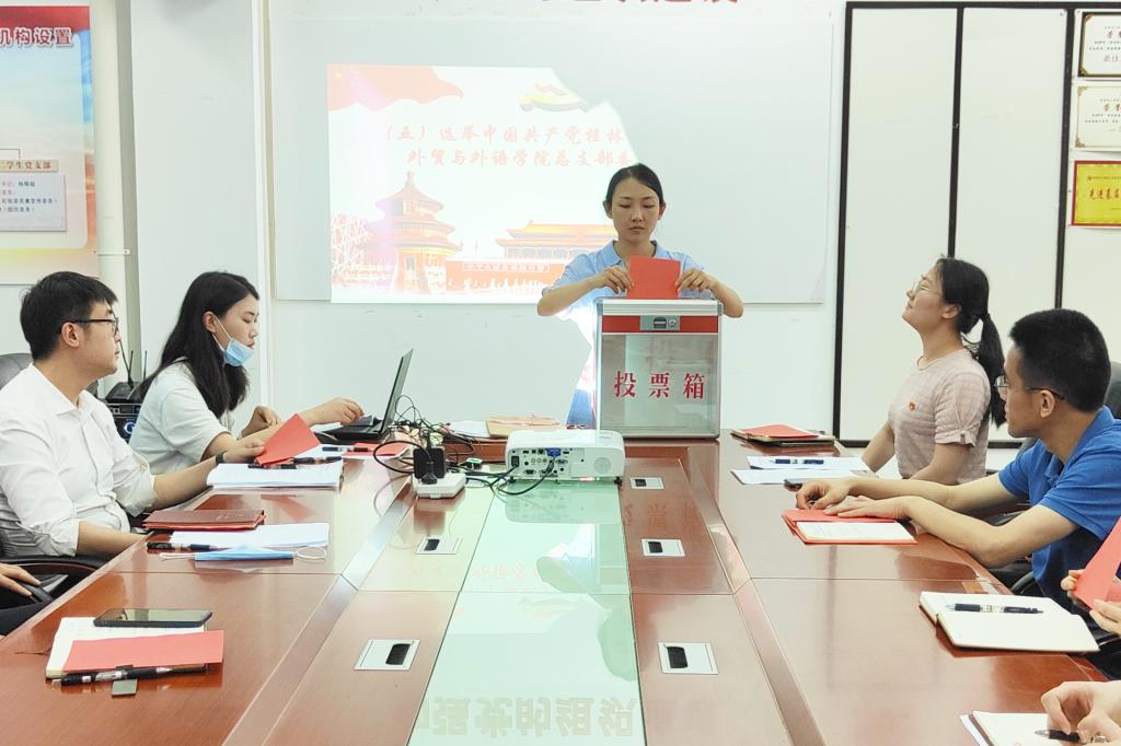 5月29日,外贸与外语学院党总支在12501党员会议室召开党员大会选举产生中共beat365官方网站外贸与外语学院总支部委员会成员。大会由学院党总支组织员钟少丽主持,学院党总支书记李刚、学校党委组织员莫德莉及学院全体正式党员参加会议,学校副校长、校企合作处处长刘跃峰以普通党员身份参加会议。