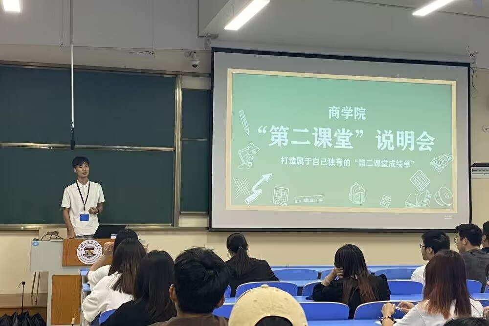 为使2023年新入学学生全面了解“第二课堂成绩单”制度,进一步促进学生德智体美劳全面发展,9月14日,商学院召开“第二课堂成绩单”制度宣讲会。2023级普生本、2021级专升本新生参加宣讲会,分团委书记马金博老师担任主讲。