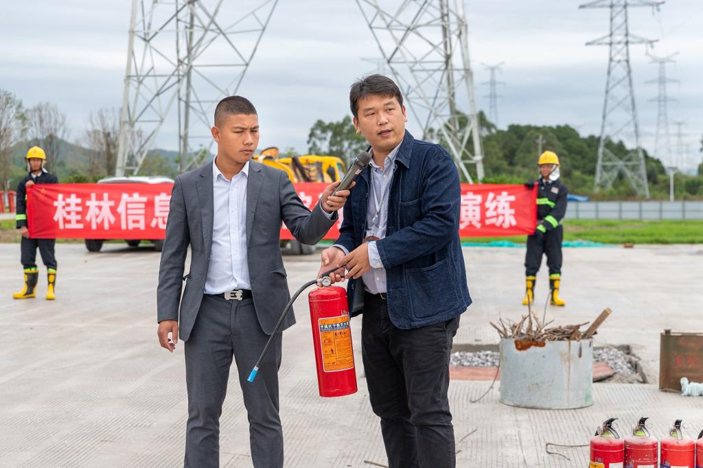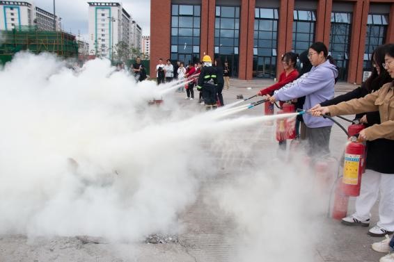 疏散逃生演练结束后,保卫主管王翀老师现场给同学们讲解灭火器的分类及使用方法,组织宿舍管理员、辅导员和学生进行灭火器实操演练,学习干粉灭火器的实际使用步骤。