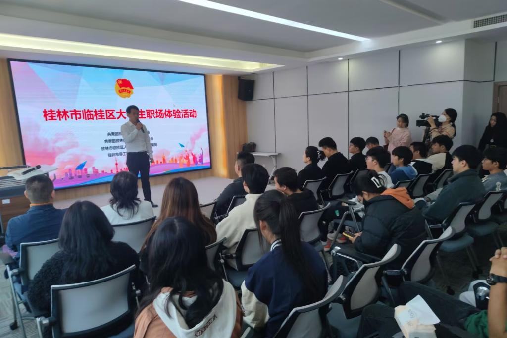 研学环节,桂林市思佳涂企业管理咨询有限公司总经理蒋斌为同学们介绍了桂林市工业体系的发展进程和历史成就,分享了临桂区高新技术企业的人才需求和发展方向,针对同学们提出的问题,结合企业实际进行了详细的解答。