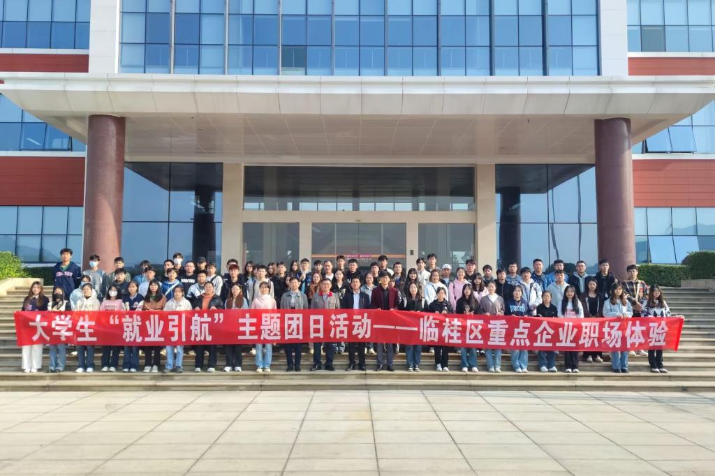 为进一步落实“共青团促就业行动”,进一步宣传桂林市临桂区优质企业,贯彻落实毕业生“留桂就业计划”,支持和帮助同学们迈好走向社会的第一步。11月27日,学校组织近百名大三、大四的毕业生和准毕业生们赴桂林福达股份有限公司、桂林鸿程矿山设备制造有限责任公司、华为信息产业园铸星智能科技有限公司等重点企业进行实地参观研学,活动由共青团桂林市临桂区委员会、桂林市临桂区人力资源和社会保障局主办,桂林市零工市场临桂区分市场协办。共青团桂林市临桂区委员会书记陈望,桂林市思佳涂企业管理咨询有限公司总经理蒋斌,学校团委书记周阳霖,学校就业指导中心蒋宇等一行9人参加了此次活动。