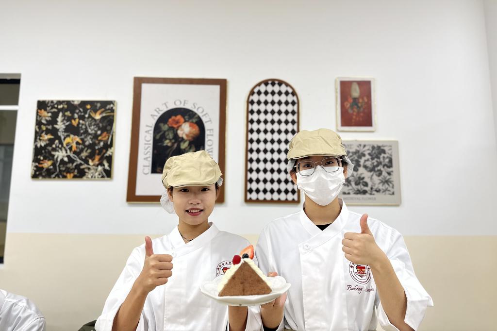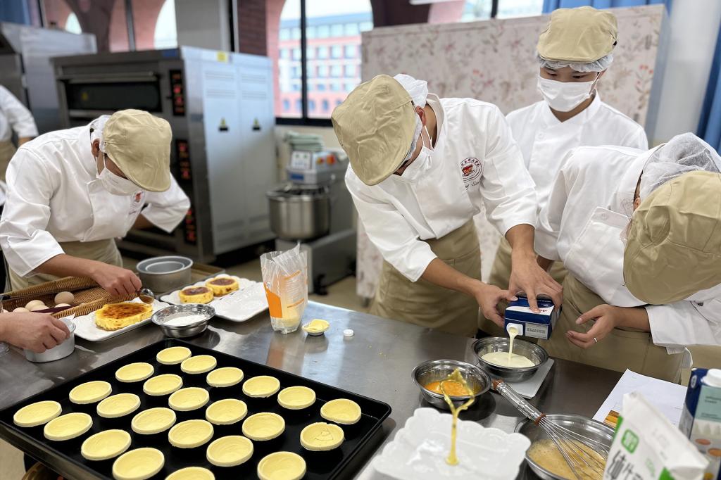 本次课程由梁老师通过现场实操,配合理论知识讲解,教授学生制作酥皮蛋挞、牛奶草莓布丁、牛奶曲奇、海盐爆浆、巴斯克芝士、巧克力蛋糕卷等西式糕点,指导学生掌握食品搅拌机的操作技巧、合理选用和调配食材、正确设置不同西点的烤箱温度与时长等,并要求学生严格遵守食品安全规定,课后准确计算食品制作成本,培养学生产品成本管控的意识与能力。