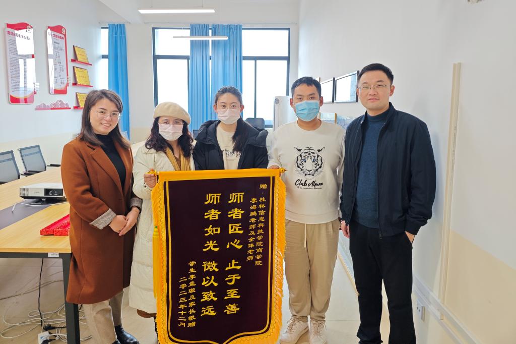 近日,商学院2018级学生李孟璇和她的母亲,千里迢迢从石家庄赶到学校,在博文楼F504会议室,她们将一面写有“师者匠心 止于至善,师者如光 微以致远”的锦旗送到辅导员李海鹏的手中,对老师的悉心教导和无微不至的关心表示感谢。