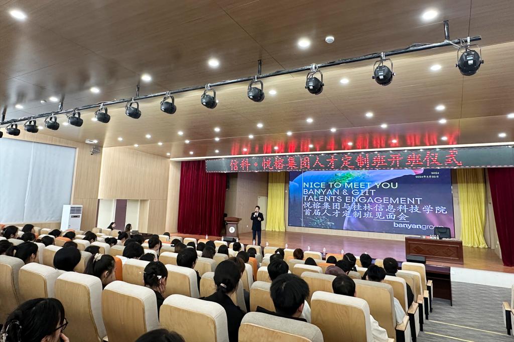 会中,南京园博园悦榕庄区域培训经理陈瑞女士组织学生开展互动游戏,调动活跃现场氛围;其后,全体师生观看了悦榕集团全球不同分区的宣传片,由阳朔悦榕庄酒店人力资源副总监陈秋凤女士从悦榕集团历史、品牌内涵、服务文化、发展理念等方面展开介绍,对本次首届人才定制培养班的实习与工作地点、选拔与考核标准、课程植入、实习岗位、就业优势进行说明;问答环节广大同学积极踊跃,从实习岗位、薪酬待遇、职业发展和工作地点等方面进行提问,由四位企业领导团队上台为参会学生一对一现场答疑。