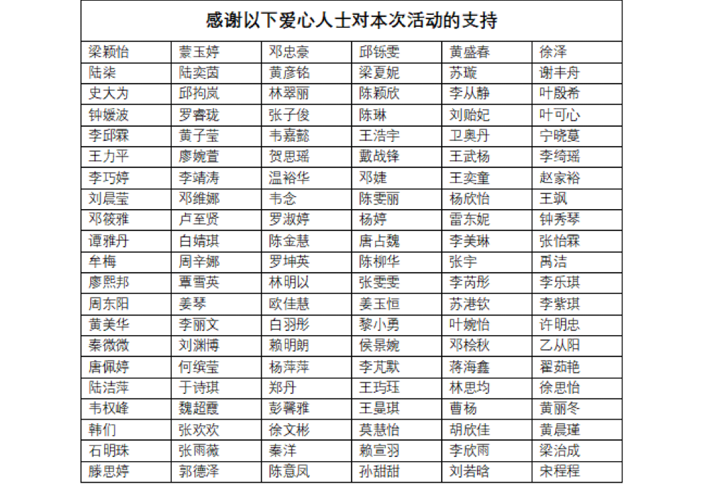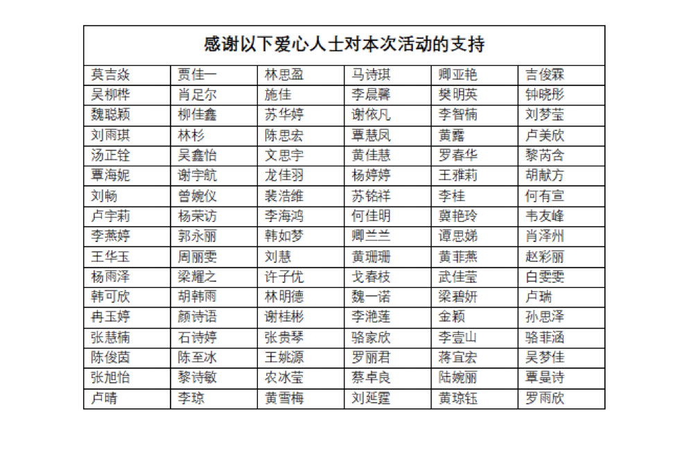 此次活动的成功举办,为特殊群体融入社会、实现自我价值提供了新的渠道,也提高了本校师生对特殊群体的认知及关爱程度。未来,我们将持续开展此类公益活动,呼吁更多社会爱心人士加入这一事业,共同为构建和谐美好的社会贡献力量。(参与爱心义卖人员名单如下图)