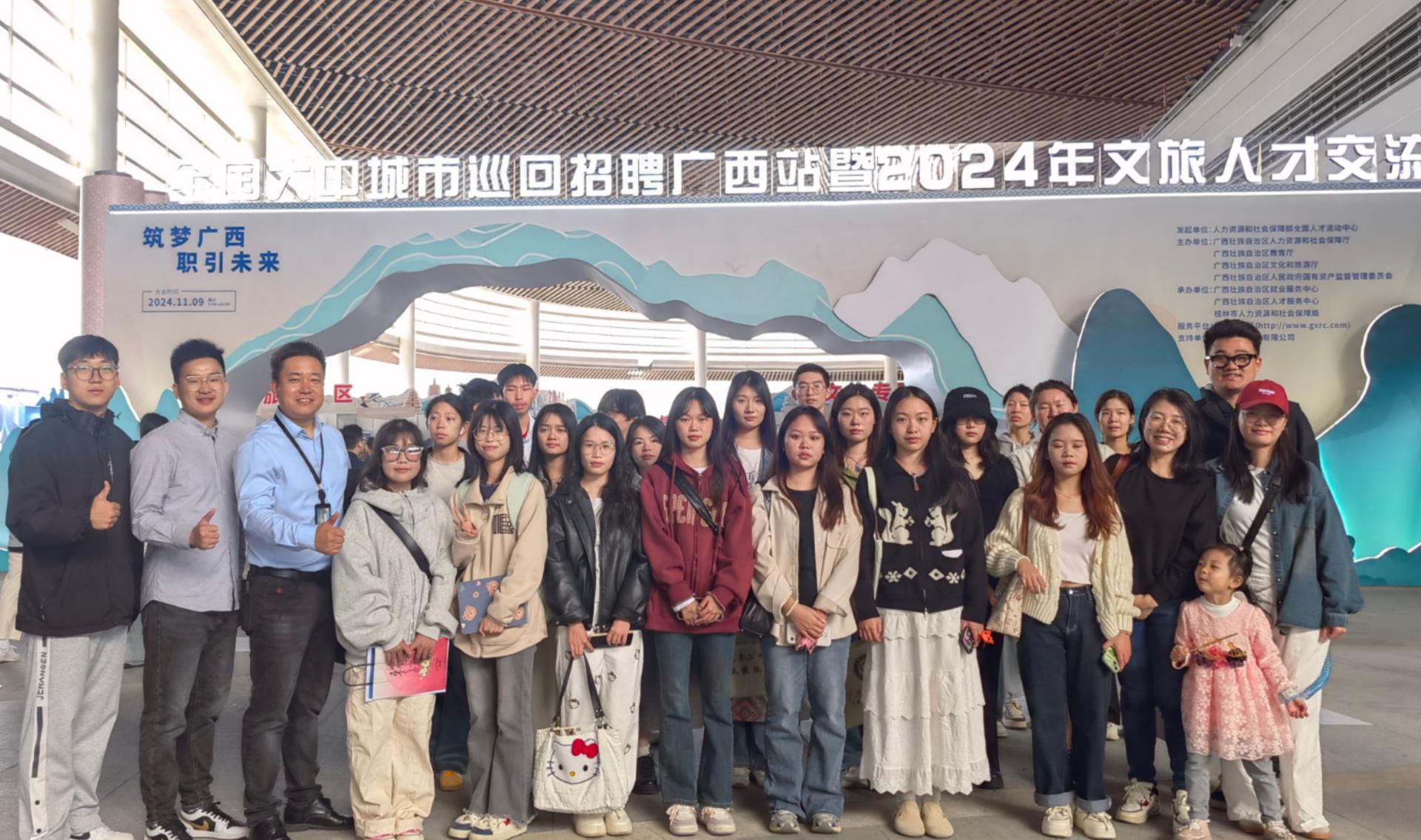 11 月 9 日,全国大中城市巡回招聘广西站暨 2024 年文旅人才交流大会在桂林国际会展中心盛大举行,250 余家企业参会,提供 7000 余个就业岗位。beat365高度重视此次招聘活动,就业指导服务中心主任、校企合作处处长李晓健亲自带队,相关工作人员及各二级学院毕业班辅导员全力配合。近 500 名应届毕业生乘坐学校统一安排的专车抵达会场。