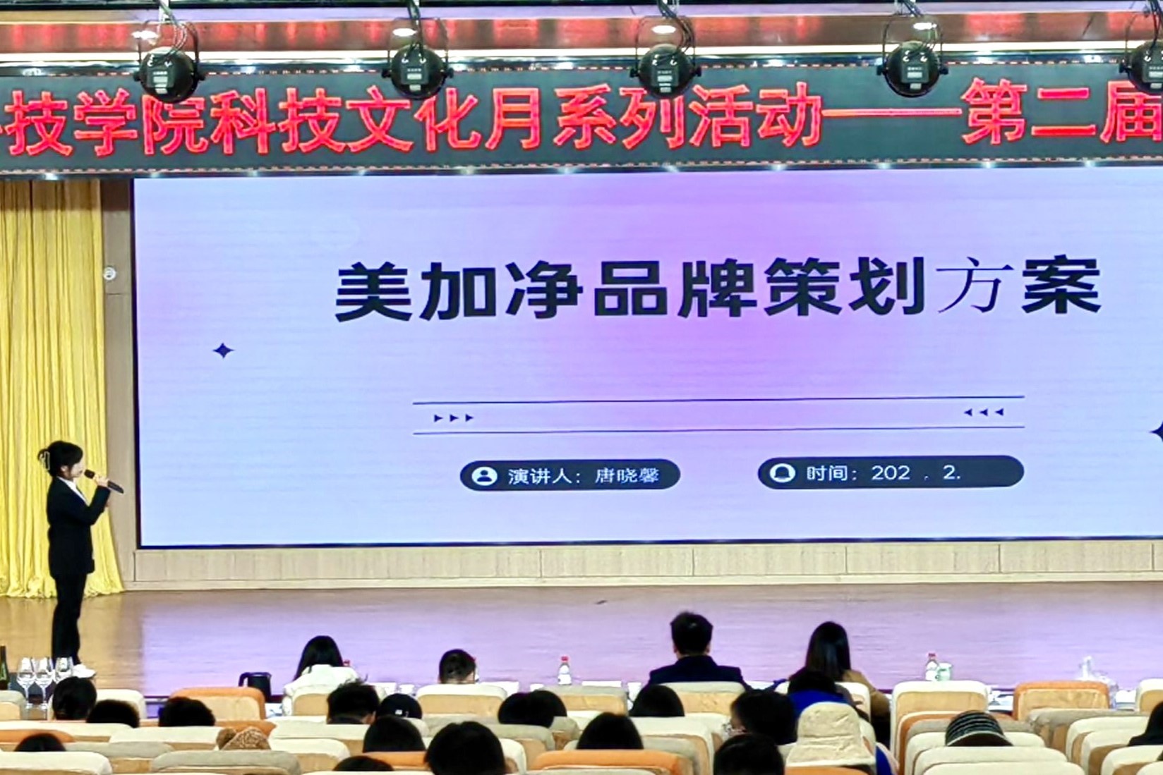 本次比赛共有来自学校不同专业的18支队伍参赛,充分展现出同学们的参赛热情和积极性。各参赛队伍按照抽签顺序依次登台陈述展示,对各自的品牌策划方案进行详尽介绍,策划案选品涵盖国际连锁酒店、护理用品、食品、酒类、餐饮等不同品牌类别。展示环节结束后,评委们分别对不同参赛小组展开提问。