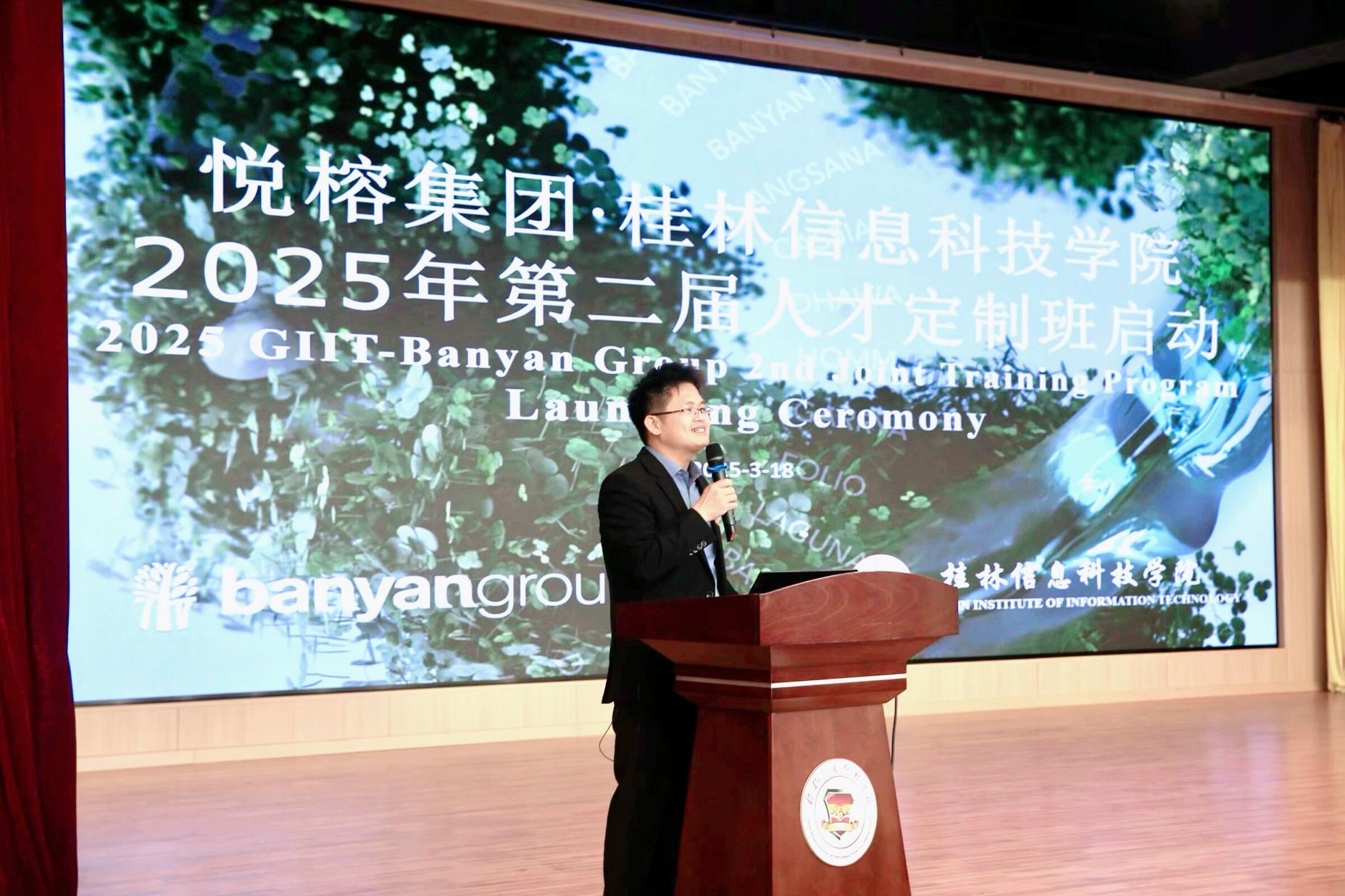 见面会开始,外贸与外语学院副院长赖安致辞。副院长赖安对悦榕集团各位代表的到来表示热烈欢迎,并期待双方能深度合作,为同学们提供优质的实践平台,共同培养酒店行业发展的高素质专业人才,同时对第二届信科·悦榕集团定制班的顺利开展寄予厚望,强调校企合作对学生成长和职业发展的意义。