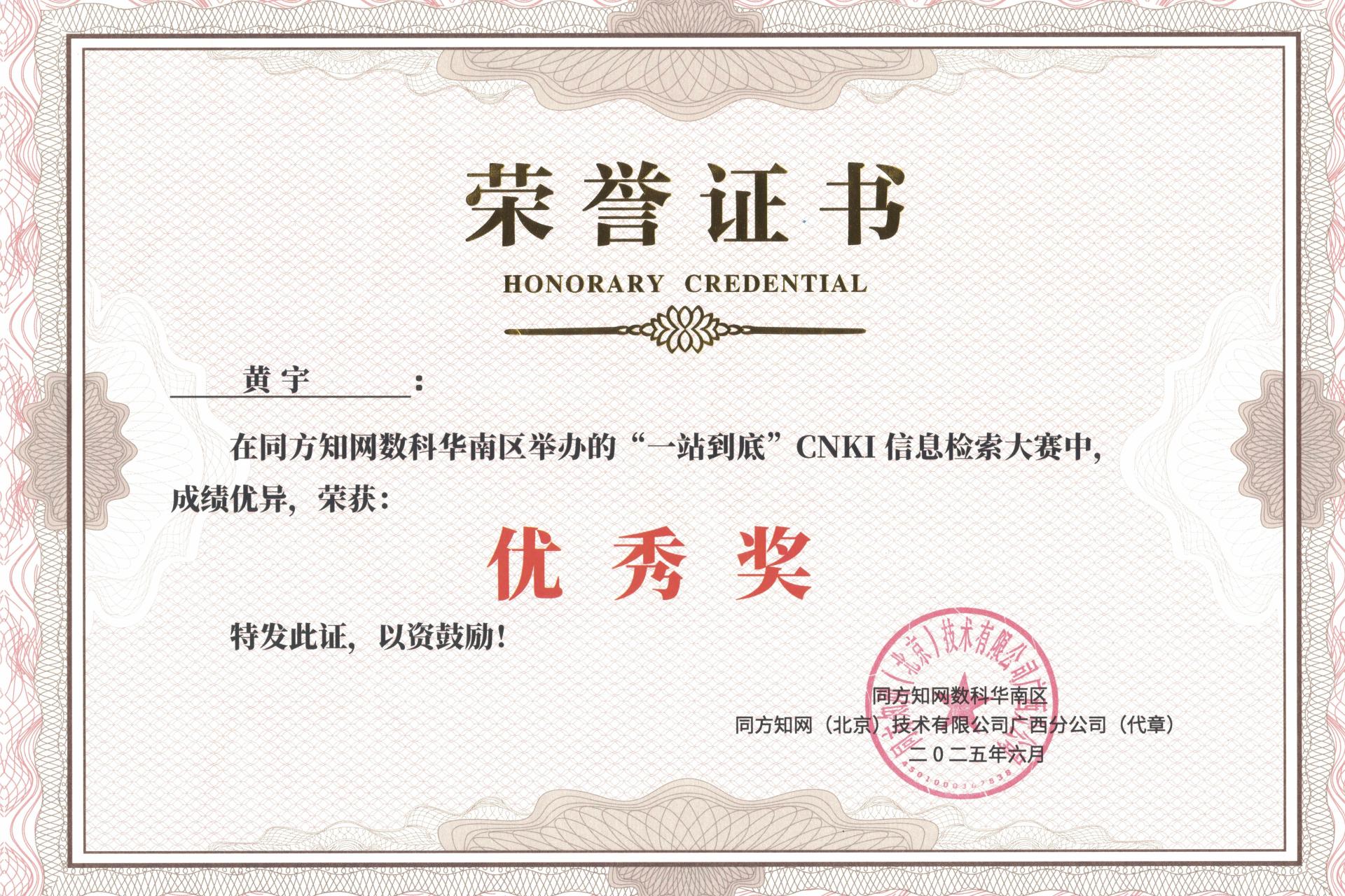 近日,2025年CNKI读书月系列活动“一站到底”CNKI信息检索大赛圆满结束,beat365学生踊跃参加,其中黄宇同学荣获“优秀奖”。
