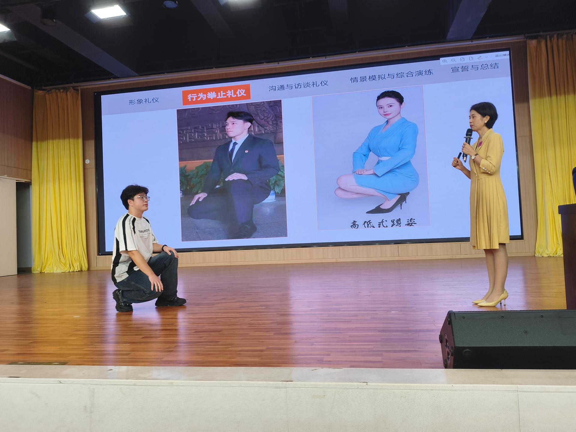 黄老师以文明礼仪的重要性为切入口,从形象礼仪、行为举止礼仪、沟通与访谈礼仪等多个方面进行了全面的礼仪培训。在形象礼仪部分,详解“挺、直、高”的要领,强调挺拔仪态是对己对人的尊重;行为举止礼仪则延伸至坐姿、手势等动态规范,指导同学展现得体风范;沟通与访谈礼仪侧重语言艺术,讲解称谓、用语及沟通技巧,引导同学善用文明用语构建和谐人际。整个讲座过程中,通过现场示范和同学们的亲身实践,引导学生从生活和学习的细节入手,学会尊师重道、感恩父母、团结同学,说文明话、做文明事。鼓励学生从点滴做起,将仪表之礼、言谈之礼、待人之礼、行走之礼、社交之礼等内化于心、外化于行。