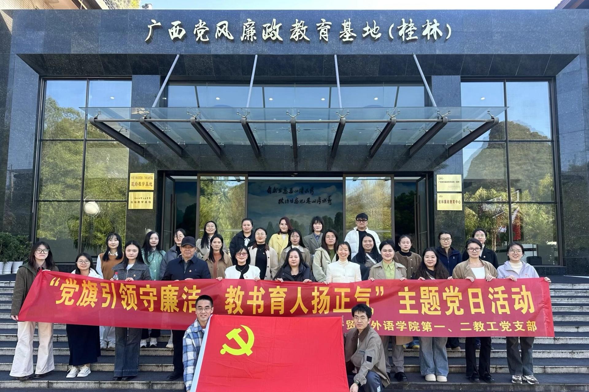 11月21日,为深入推进新时代廉洁文化建设,持续巩固党纪学习教育成果,切实筑牢全院教工党员的廉洁思想防线,外贸与外语学院第一、二教工党支部党员赴广西党风廉政教育基地(桂林)开展“沉浸式”廉政警示教育活动,在山清水秀的自然底色中感悟政治生态的“清风正气”。