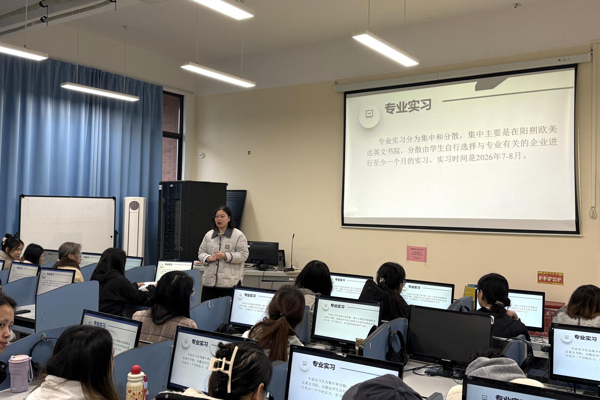 2025年12月23日,外贸与外语学院在F103教室召开2023级英语专业学生实习说明会。会议由英语专业教研室副主任谢彩华老师主持,学院副院长赖安老师、英语专业教研室主任王雪利老师、2023级辅导员罗吉凤老师及相关实习项目负责老师出席,2023级英语专业全体学生参加。
