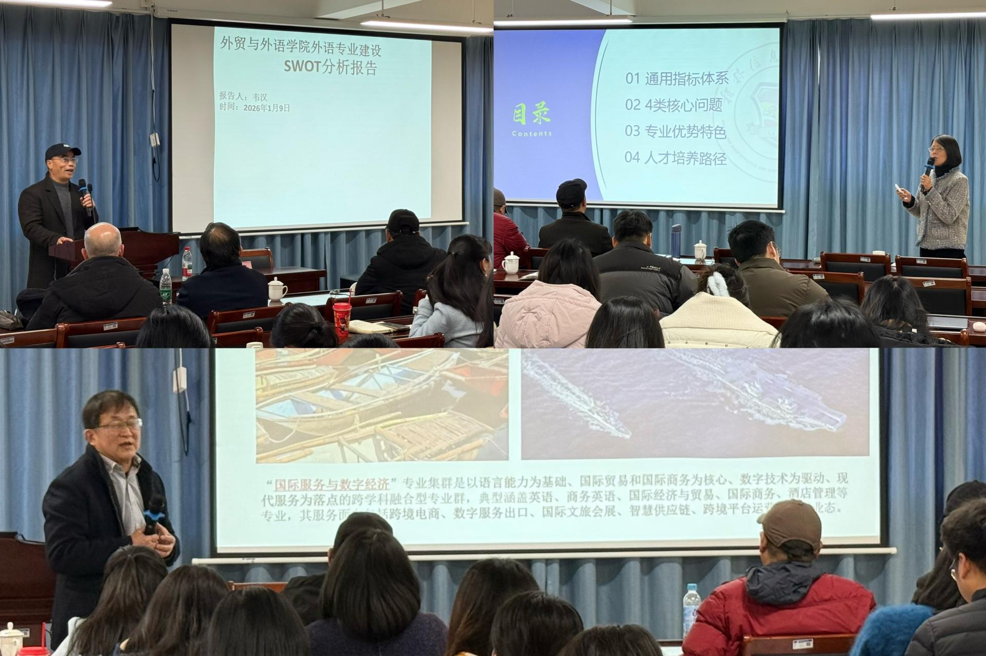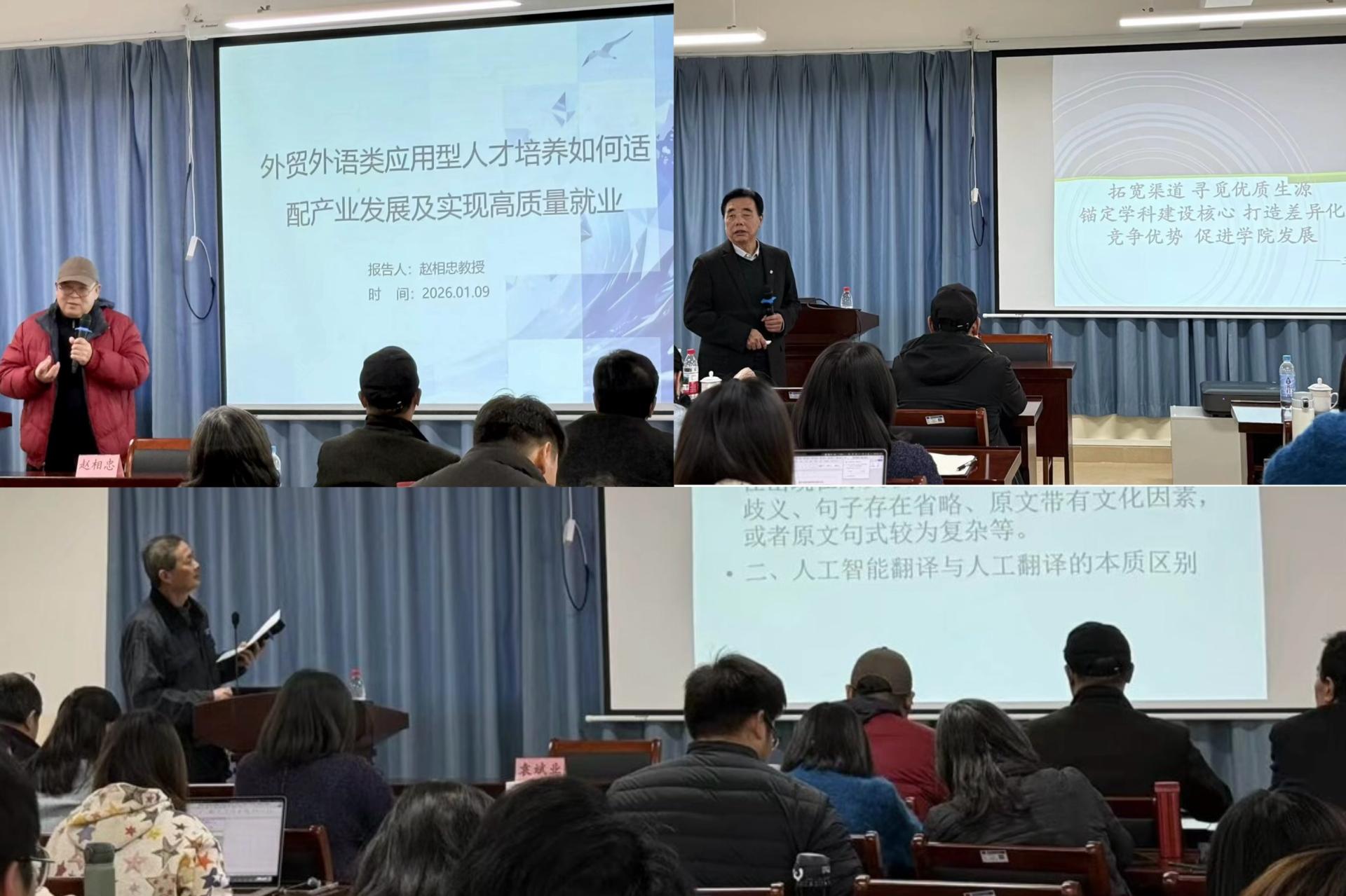 1月9日下午2:00,外贸与外语学院在文汇楼L702报告厅成功举办第二期高质量发展论坛。本次论坛以“外贸与外语学院高质量发展:问题、治理与进路”为主题,聚焦人工智能、新质人才培养与高质量就业等关键议题,旨在回应教师关切、凝聚发展共识,推动学院在应用型办学道路上实现新突破。
