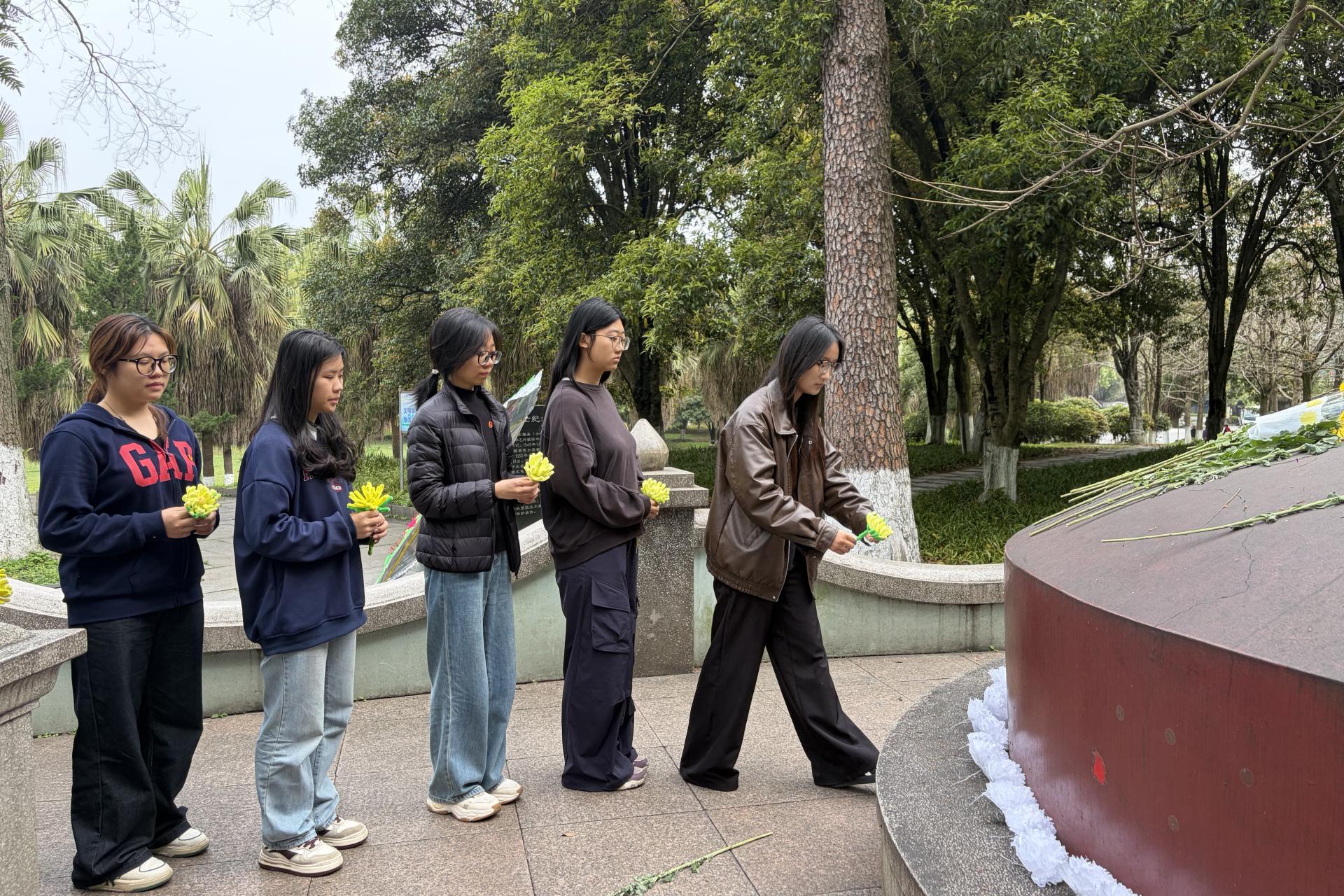 祭扫现场庄严肃穆,全体参与人员身着深色服装,党员同志整齐佩戴党员徽章,神情肃穆地肃立在陈光烈士纪念塔前。活动伊始,外贸与外语学院第一学生党支部书记王婧雯发表讲话,回顾陈光烈士的革命历程,号召全体党员团员铭记先烈事迹,传承英烈精神,坚守清正廉洁底线,立足本职勇担时代使命。随后,全体人员脱帽默哀、鞠躬致敬,深切悼念为革命事业献出宝贵生命的先烈。默哀结束后,党员和团员代表手持亲手制作的扭扭棒菊花,列队有序环绕纪念碑一周,依次将菊花敬献在烈士墓前,表达对先烈的深切缅怀与崇高敬意。