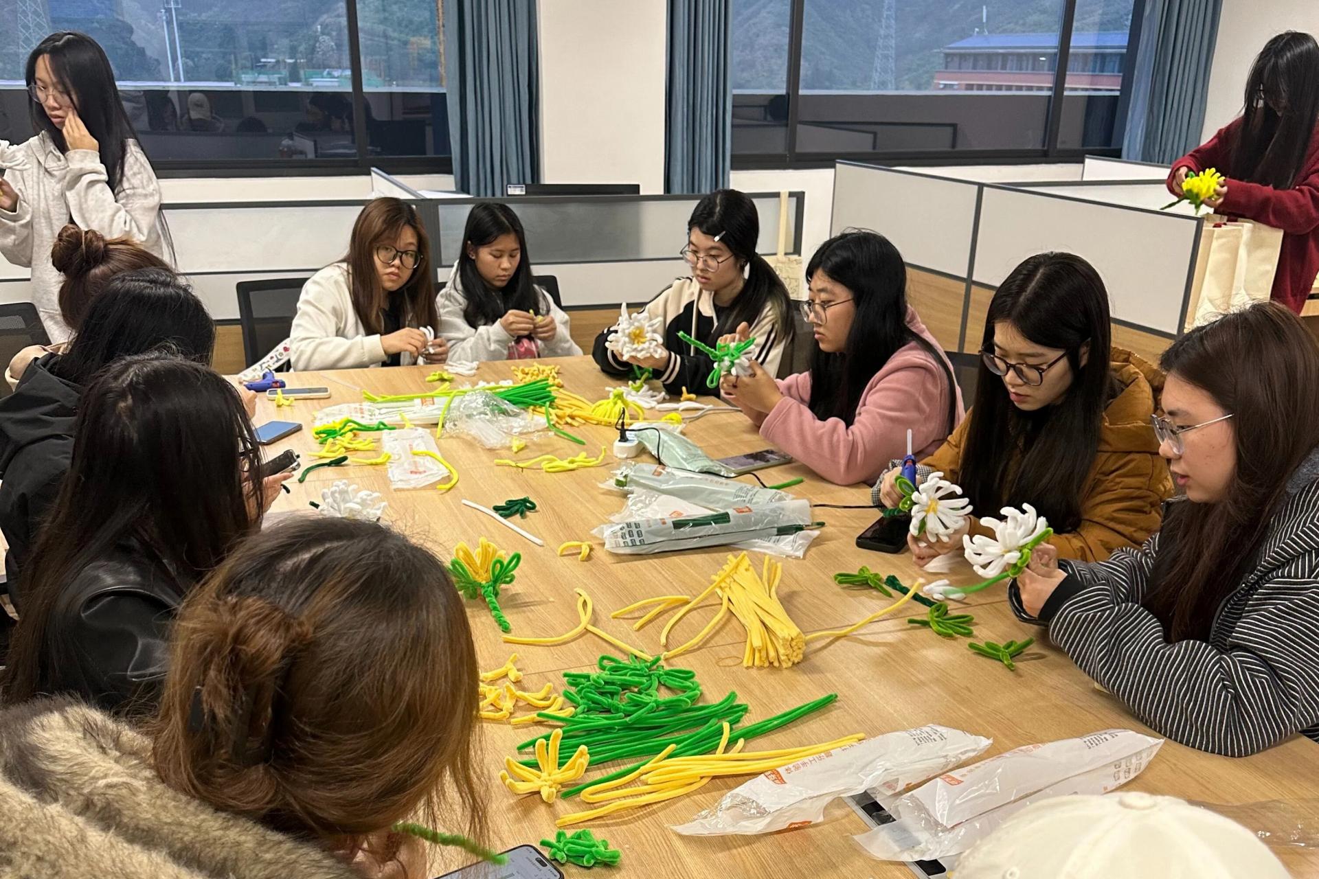 组织党员与团员制作手工扭扭棒菊花现场