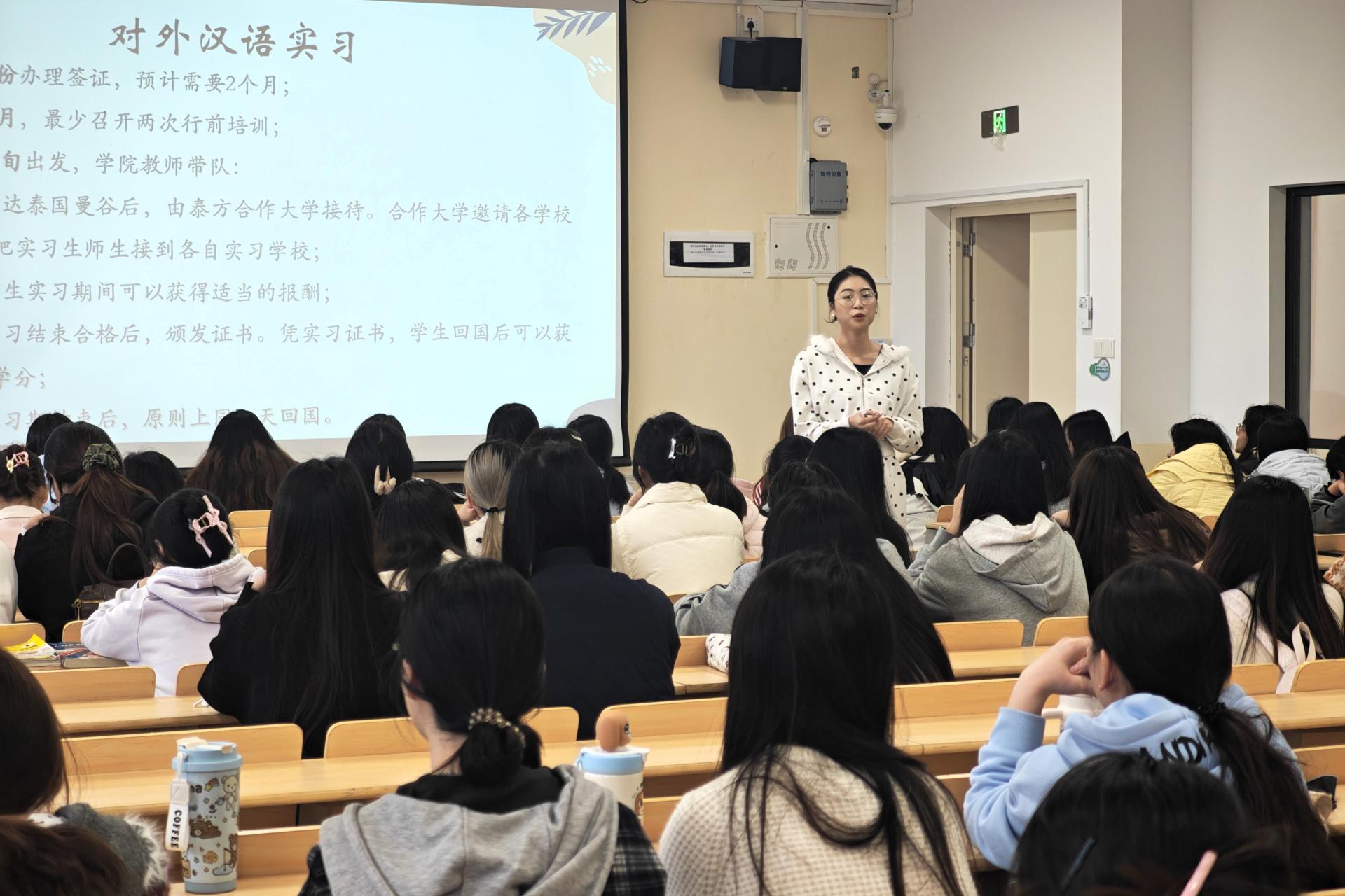 宣讲会上,陈瑶结合自身在泰从教经历,分享了国际中文教育志愿者的选拔流程、工作日常与成长收获,鼓励学弟学妹立足英语、商务英语专业优势,勇敢走出国门,在国际交流舞台上展现自我、传递友谊,用实际行动讲好中国故事。