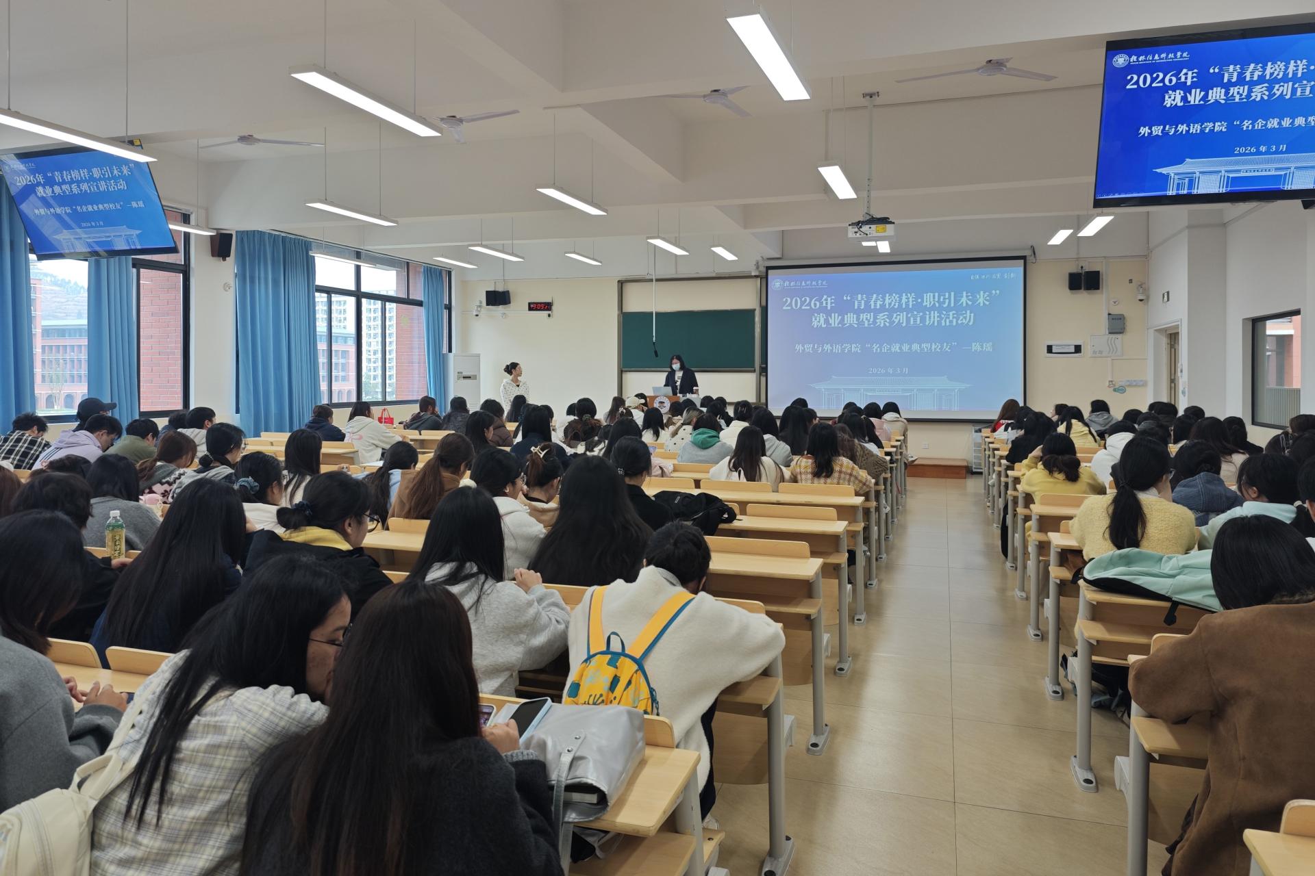 为充分发挥优秀校友榜样示范作用,引导学生明确职业方向、拓宽国际化就业视野,3月25日,外贸与外语学院在D308教室成功举办“青春榜样・职引未来”就业典型系列宣讲活动。学院党委书记廖星男、党委副书记杨锦超,英语专业教研室副主任谢彩华、商务英语专业教研室副主任闵世琦、英语专业专任教师刘书琳,辅导员王莹、罗吉凤出席活动,2026届、2027届毕业生到场聆听交流。