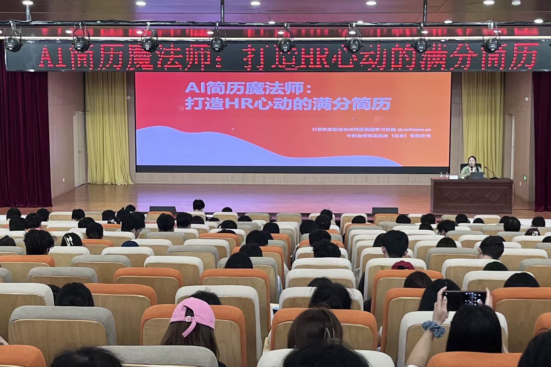为深入贯彻学校“十五五”规划,着力提高学生的就业能力和就业质量,4月10日下午,图书馆在博文楼F107举办了一场主题为“AI简历魔法师:打造HR心动的满分简历”的讲座。讲座由中新金桥信息技术(北京)有限公司高级培训师罗琰主讲,图书馆老师梁为民主持,全校各年级学生代表300余人参加了此次讲座。