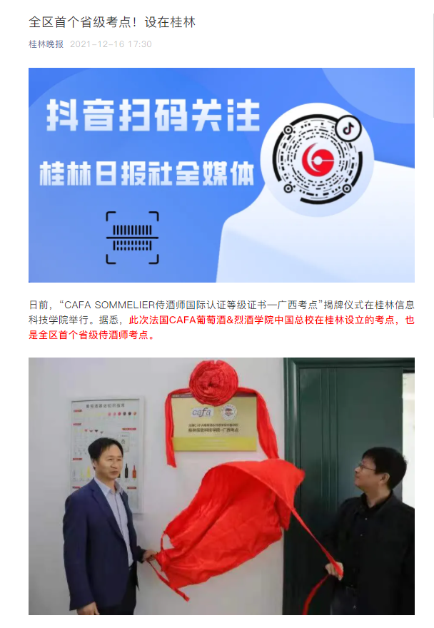 日前,“CAFA SOMMELIER侍酒师国际认证等级证书—广西考点”揭牌仪式在beat365官方网站举行。据悉,此次法国CAFA葡萄酒&烈酒学院中国总校在桂林设立的考点,也是全区首个省级侍酒师考点。
