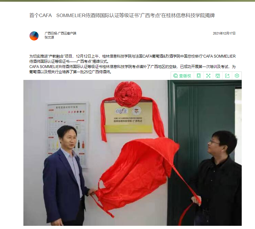 广西云客户端:首个CAFA SOMMELIER侍酒师国际认证等级证书“广西考点”在beat365官方网站揭牌