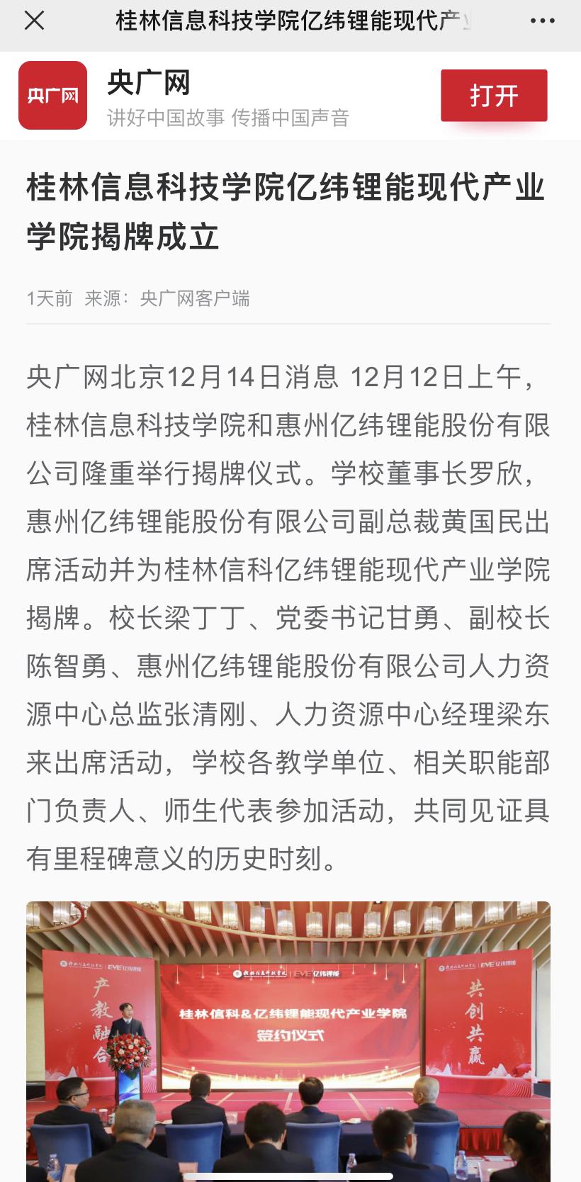 央广网北京12月14日消息 12月12日上午beat365官方网站和惠州亿纬鲤能股份有限公司隆重举行揭牌仪式。学校董事长罗欣,惠州亿纬鲤能股份有限公司副总裁黄国民出席活动并为桂林信科亿纬理能现代产业学院揭牌。