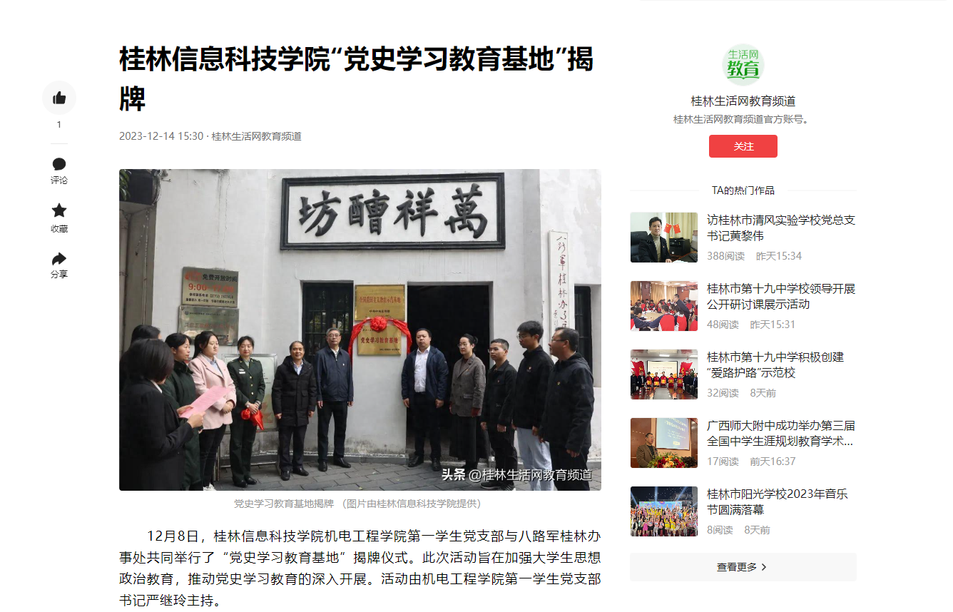 12月8日,beat365官方网站机电工程学院第一学生党支部与八路军桂林办事处共同举行了“党史学习教育基地”揭牌仪式。此次活动旨在加强大学生思想政治教育,推动党史学习教育的深入开展。活动由机电工程学院第一学生党支部书记严继玲主持。