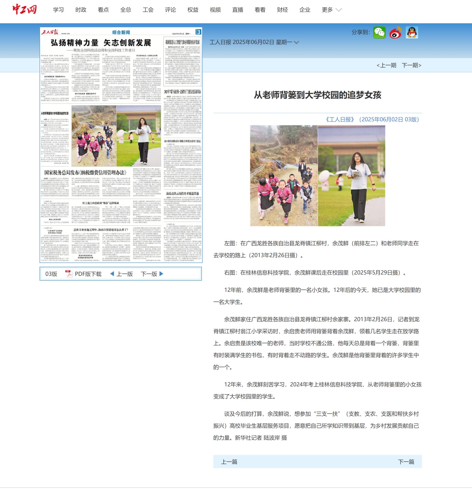 工人日报-中工网链接:从老师背篓到大学校园的追梦女孩