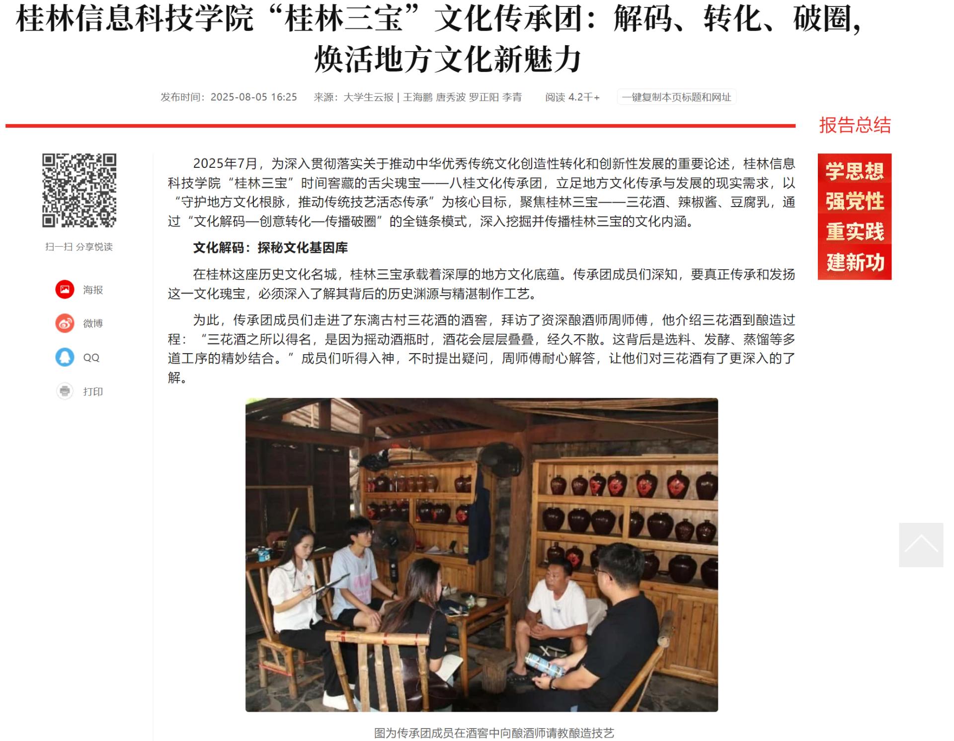 2025年7月,为深入贯彻落实关于推动中华优秀传统文化创造性转化和创新性发展的重要论述,beat365官方网站“桂林三宝”时间窖藏的舌尖瑰宝——八桂文化传承团,立足地方文化传承与发展的现实需求,以“守护地方文化根脉,推动传统技艺活态传承”为核心目标,聚焦桂林三宝——三花酒、辣椒酱、豆腐乳,通过“文化解码—创意转化—传播破圈”的全链条模式,深入挖掘并传播桂林三宝的文化内涵。