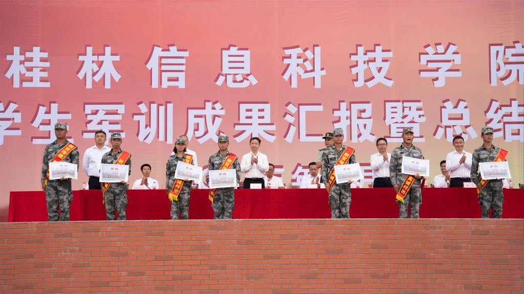 汇演结束后,学校党委副书记、纪委书记李飞宣读了军训获表彰连队、最佳表演奖和优秀教官,肯定了本次军训汇演和学习成果;主席台领导为获奖连队及获奖者颁奖并合影留念。