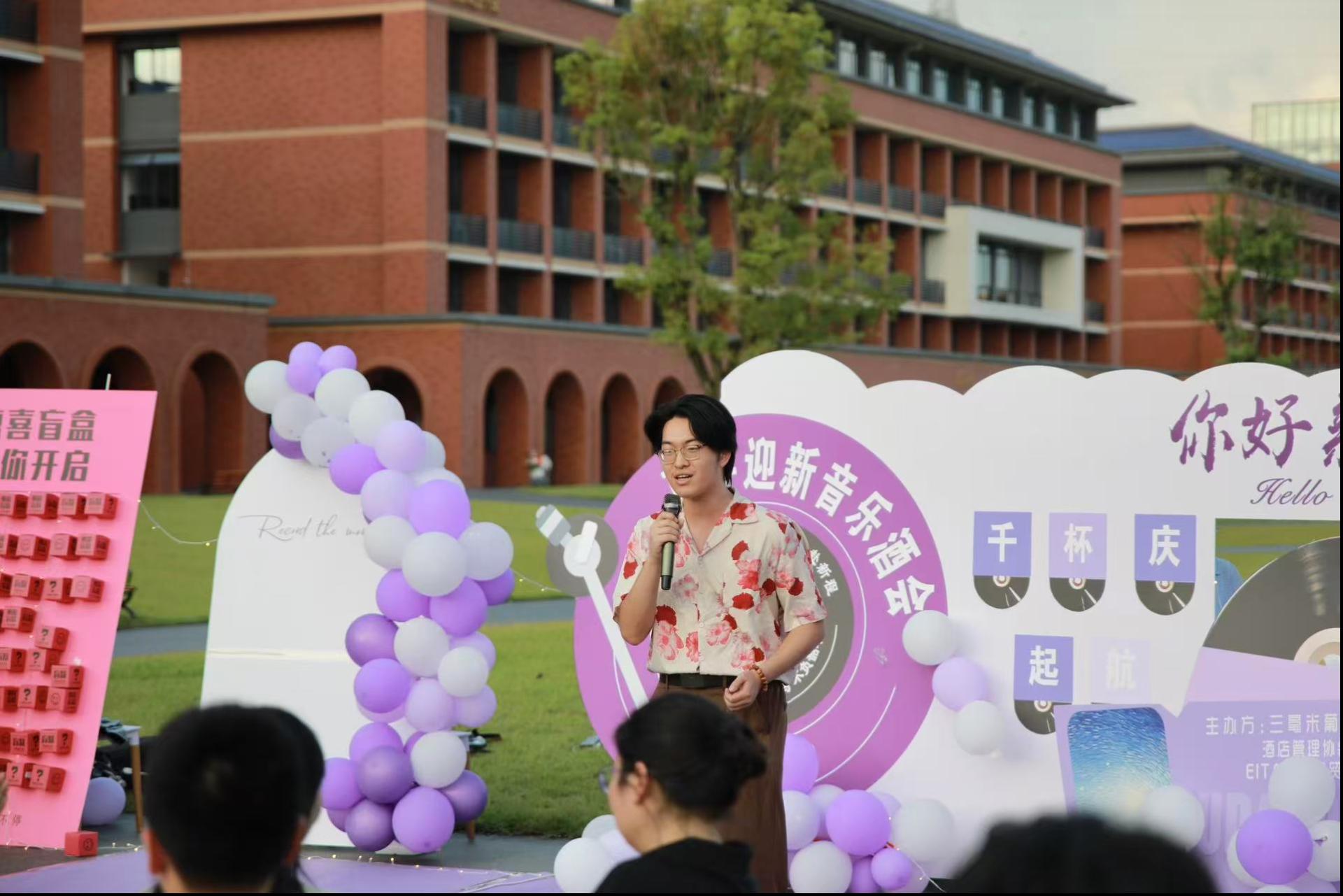 舞蹈后,EITA箐鹰国贸赛社指导老师贾砚淮登台。他代表学校和社团欢迎2025级新生加入“大家庭”,并介绍三大社团特色,强调社团作为“第二课堂”对提升学生综合素质的重要性,鼓励新生积极参与社团活动,在社团中寻热爱、交挚友。质朴话语让新生对社团生活满怀期待。