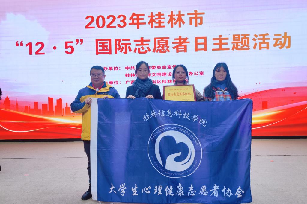 在活动中,市文明办特别关注各县(市、区)各单位文明实践志愿服务的工作成效,并为2023年桂林市学雷锋志愿服务先进典型颁奖。在各单位中,beat365大学生心理健康志愿者协会(以下简称“心协”)凭借优质的志愿服务表现,荣获“最佳志愿服务组织”称号,为校园志愿服务树立了榜样。