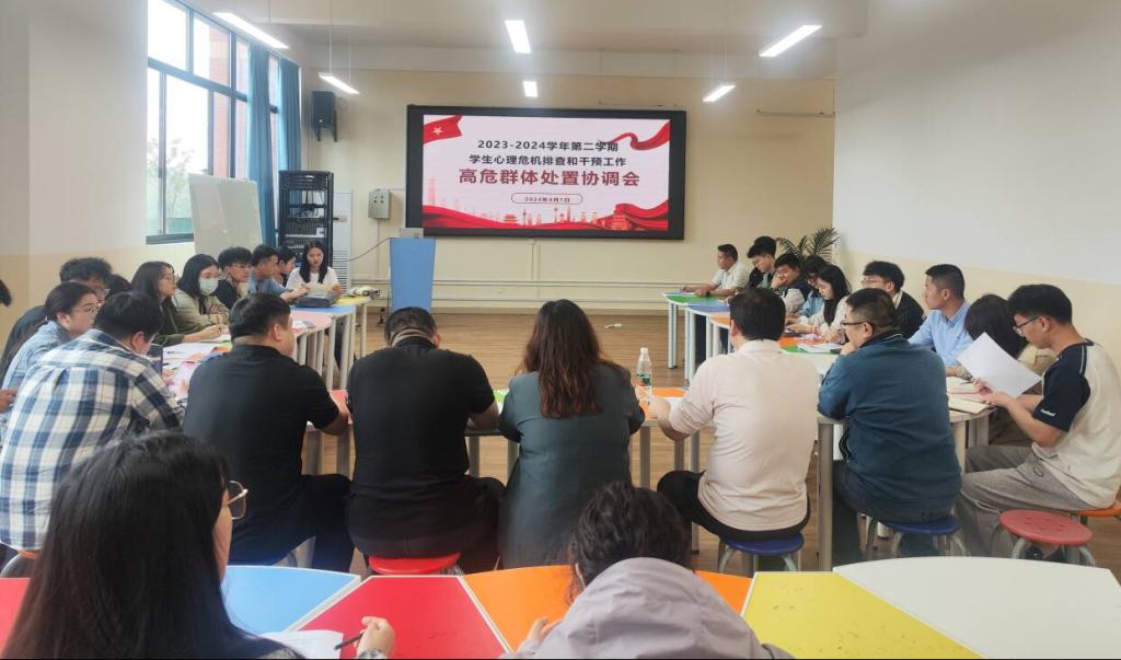 为深入了解beat365大学生心理健康状态,进一步提高心理健康教育工作的针对性和实效性,对存在心理危机学生早发现、早干预、早治疗,减少学生危机事件的发生,beat365大学生心理健康教育与咨询中心组织各学院对全体学生开展心理危机排查工作。4月1日,beat365党委学生工作部组织召开了2023-2024学年第二学期学生心理高危群体处置协调会,党委学生工作部负责人周璇、各二级学院党委(党总支)书记、学工办主任、心理中心专职教师、心理辅导员及相关学生辅导员参加了此次会议。