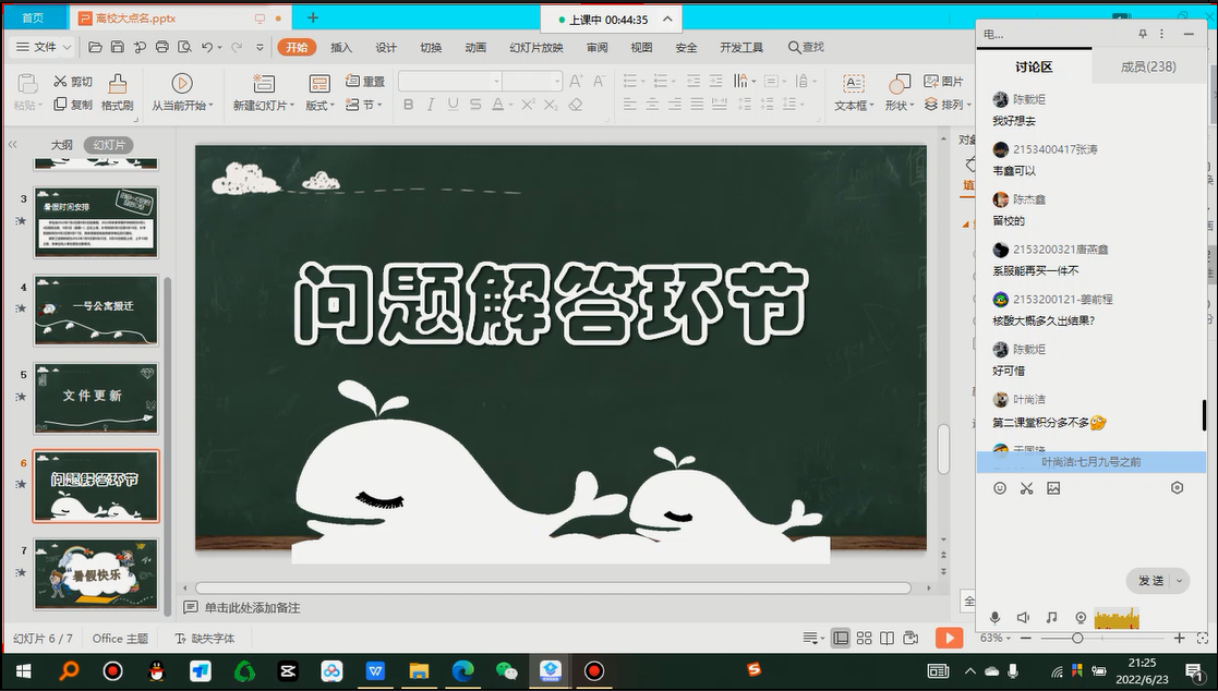 会上,辅导员于凌浩首先向学生们强调了回家的安全问题,教育学生在暑假期间妥善保管好自己的贵重物品并认真检查宿舍安全卫生,要切实注意往返途中的交通安全以及加强人身财产安全防范意识,及时与家长保持联系。随后,就“游泳溺水、交通安全、旅游外出、防汛防暑、用电安全、消防安全、饮食卫生”等七方面均提出了具体的要求,同时还希望全体学生合理安排学习、运动、生活,适度休息、提升自我,过一个充实愉快安全、有收获、有意义的暑假。最后,辅导员于凌浩在评论区针对性回答了同学们对暑假安排提出的各种疑问。