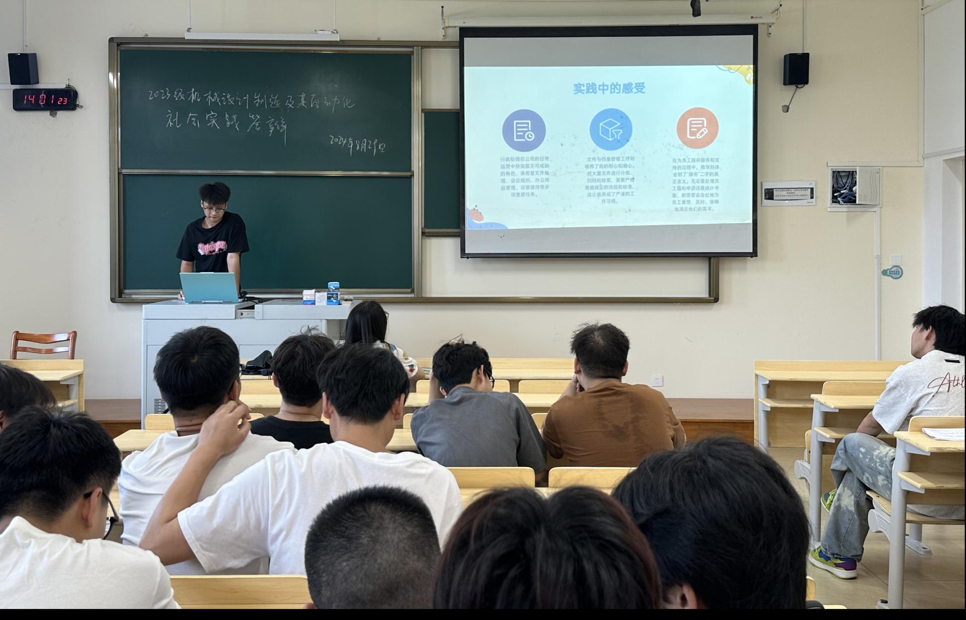 为检验同学们在2024年大学生社会实践中的实践成果,进一步做好社会实践成绩认定工作,机电工程学院于8月29日组织机械设计制造及其自动化专业学生的社会实践成果验收工作。本次答辩由2023级辅导员担任评委,机械设计制造及其自动化专业全体学生参加,主要分为答辩人陈述与提问答辩两个环节。
