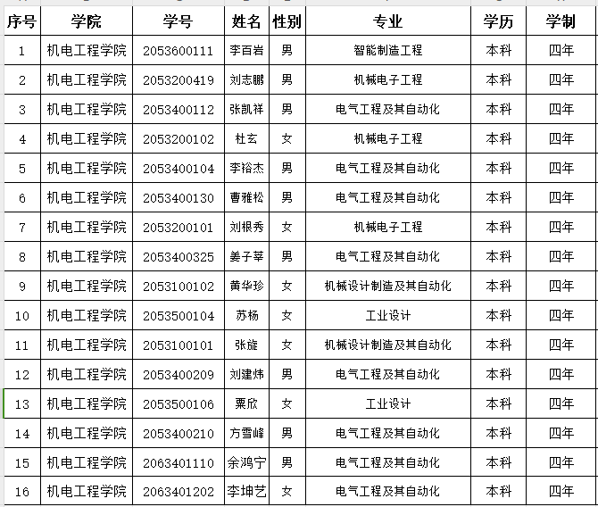 根据区优秀毕业生相关评奖条件,本着公平、公正、公开的原则,经学生个人申请,学院评审,现拟推荐李百岩等16位同学为机电工程学院广西区2024届普通高等教育优秀毕业生候选人,具体学生名单公示如下,公示期3天(2024年3月22日至3月25日)。如有异议,请向辅导员反馈。
