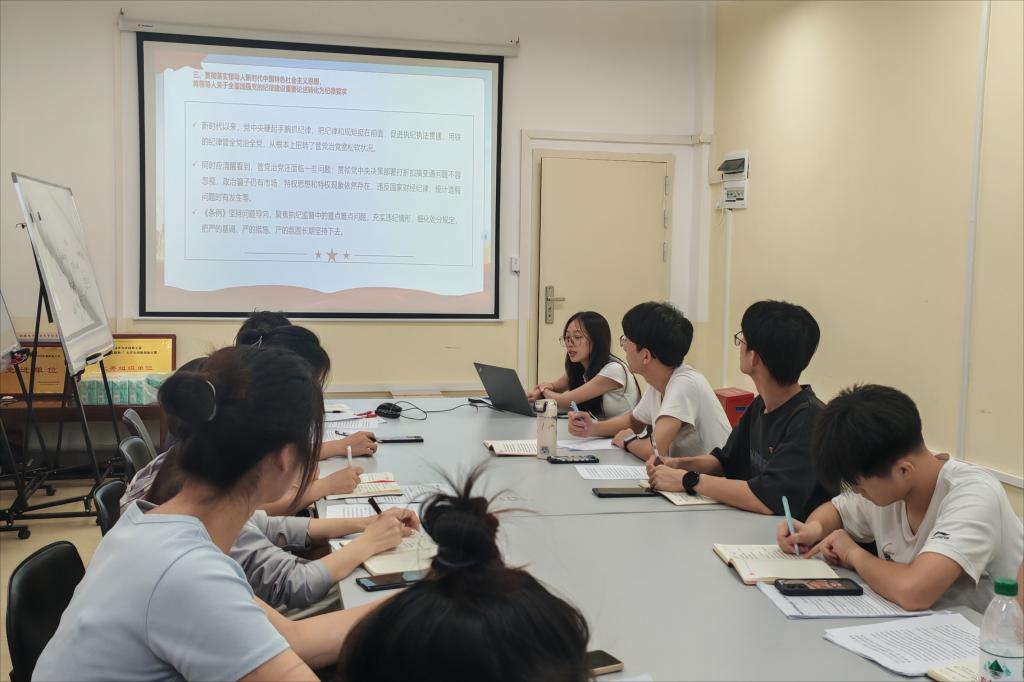 7月5日,机电工程学院学生党支部开展“学条例守党纪”纪律党课,胡姗同志带领支部党员共同学习。