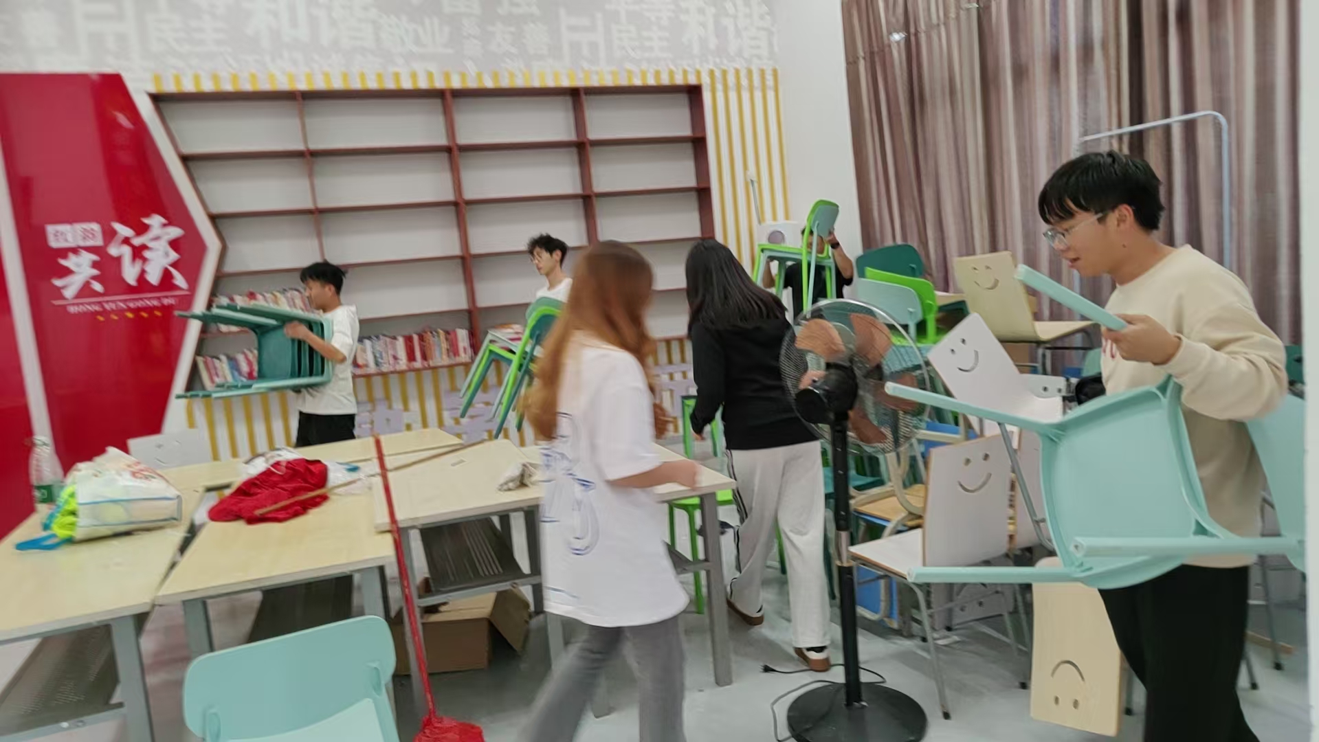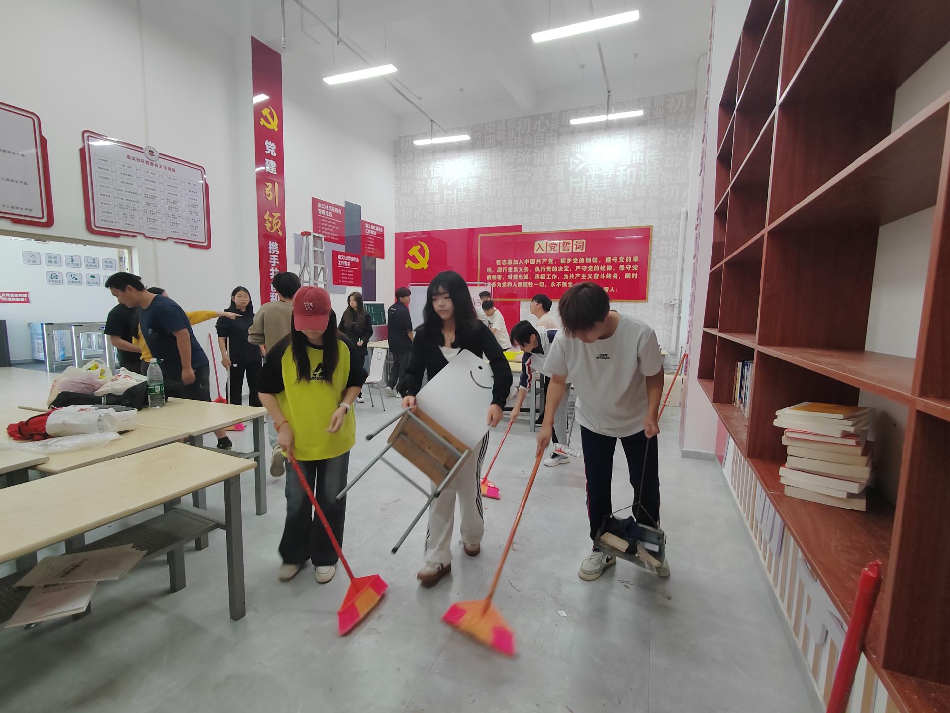 活动中,第6期入党积极分子迅速投入到搬书、图书摆放归类的工作中。他们小心翼翼地搬运着厚重的书籍,生怕弄脏了书页或损坏了封面。在摆放图书时,他们更是细心地按照分类标签,将每一本书都归位到正确的位置。在大家的共同努力下,原本杂乱的书架变得井井有条,为读者提供了一个更加舒适、便捷的阅读环境。发展对象们重点对崇义楼一楼学生活动中心进行了清扫整理。他们分工明确,有的扫地、有的擦窗、有的整理桌椅。虽然汗水浸湿了他们的衣衫,但他们的脸上始终洋溢着笑容。在他们的辛勤劳动下,学生活动中心焕然一新,为同学们提供了一个更加整洁、舒适的学习活动场所。