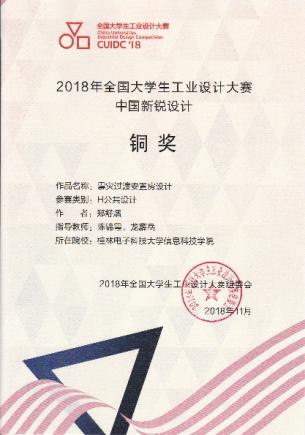 学生各类大赛和双创成果:近年来,本专业学生在全国大学生工业设计大赛、全国高校数字艺术设计大赛等比赛中获得各级各类奖项146项。学生先后在全国大学生工业设计大赛中,获得全国铜奖1项、区级一等奖20项、二等奖39项、三等奖60项;全国高校数字艺术设计大赛,区级一等奖1项、二等奖6项、三等奖6项;广西高校大学生创新设计与制作大赛,区级一等奖3项、三等奖2项。在行业竞赛中获得创意中国设计大奖二等奖2项、三等奖5项,中国高校美术作品学年展二等奖1项、三等奖1项。