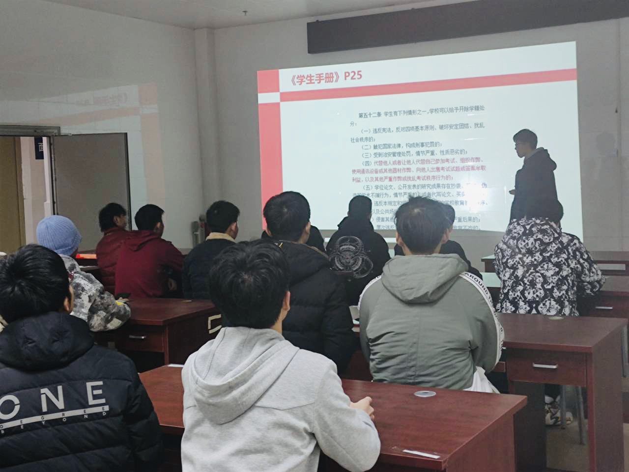 会议开始先是由辅导员胡平华为大家详细讲解了什么是学业警示,即学校依据学籍管理办法,对学生每学期的学习情况进行统计、行为表现进行评估,对学生可能已经发生的学习问题和学业困难进行警示,告知学生本人及家长并采取相应的补救措施,帮助学生完成学业的一种信息沟通和危机预警干预制度。紧接着,辅导员王书蕊又向大家普及了关于学业警示的红牌、黄牌两种警告制度。