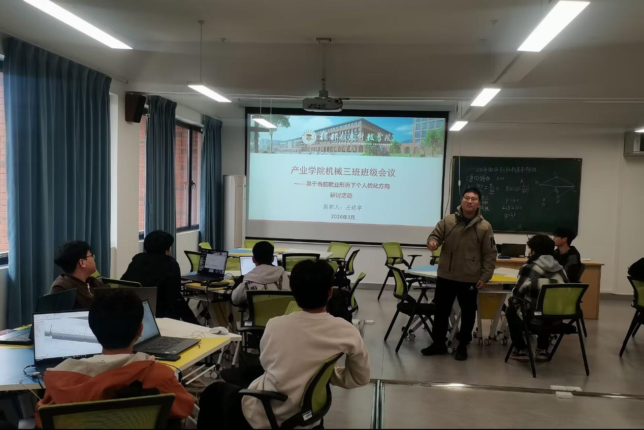 为进一步帮助班级同学认清当前就业形势,明确个人发展方向,提升就业竞争力,产业学院机械三班于2026年3月30日组织开展了以“急回特性——基于当前就业形势下个人优化方向”为主题的研讨活动。本次活动由王述宇老师组织,班级全体同学积极参与。