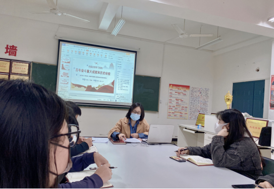 课堂中,支部书记严老师主要围绕:会议基本概况简介、充分肯定十九届五中全会以来中央政治局的工作、为何要总结党百年奋斗的重大成就和历史经验、中国共产党百年奋斗的重大成就、中国共产党百年奋斗的历史意义和历史经验几个方面阐述。党的百年是马克思主义基本原理同中国具体实际相结合,不断推进马克思主义中国化的100年,同时党的历史是中华民族的独立、解放、繁荣和为中国人民的自由、民主、幸福而不懈奋斗的历史。