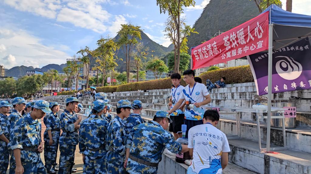 九月的桂林,依然骄阳似火,酷暑难耐。为了帮助新生在军训期间防暑降温,加强与新生的沟通与联系,9月16日-17日下午,信科物业公寓服务中心携手校自律委员会在开展“军训送清凉,茶饮暖人心”志愿服务活动,向正在烈日下军训的大一新生、教官送去解暑茶。