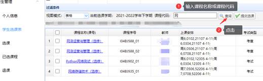 ①选课系统开放时,学生登录教务系统,点击选课,点击查询,课程列表会出现本学期所开设的可选课程列表,从中找到相应的课程序号,进行勾选后,再点提交选课。