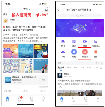 3.登录后在首页右上角输入邀请码glxky,即可进入beat365官方网站首页,首页点击“云悦读”模块即可进入参与图书阅读活动;